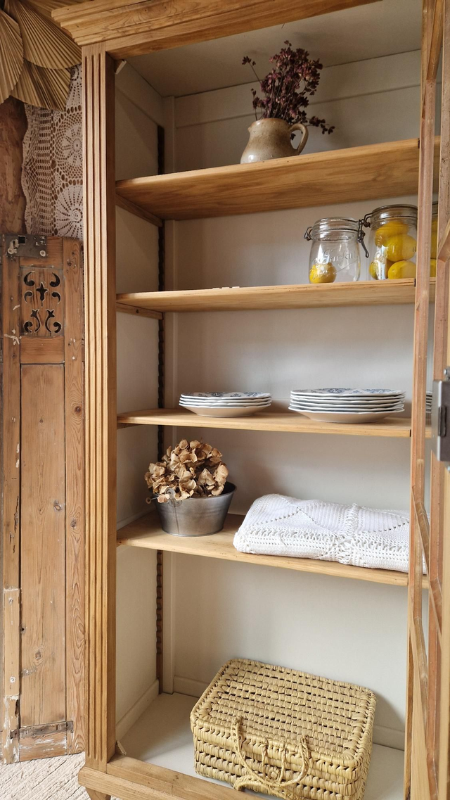 L'intérieur est travaillé dans des tons lin et les étagères en bois brut ciré.
