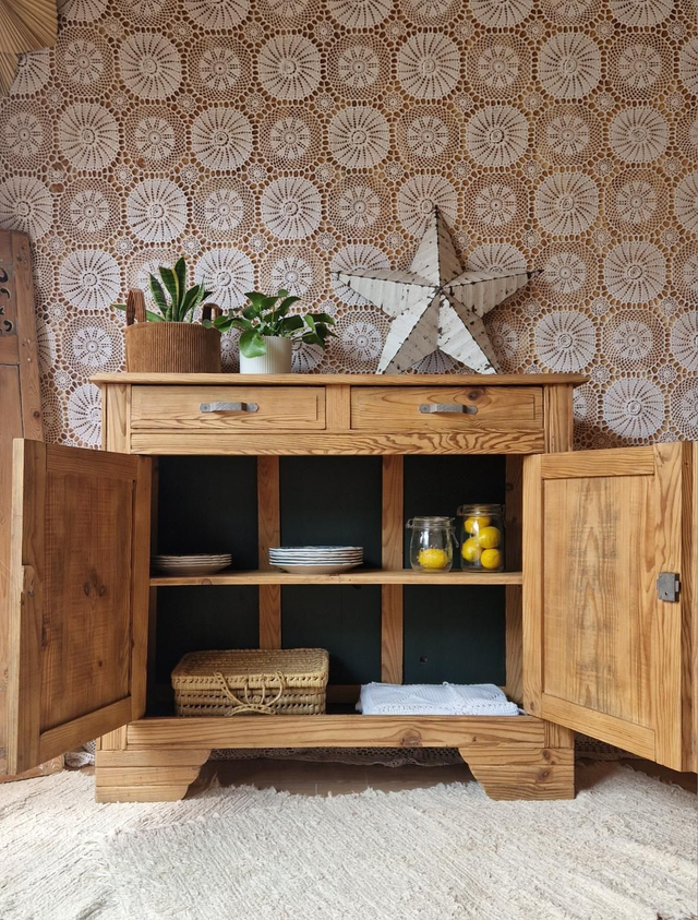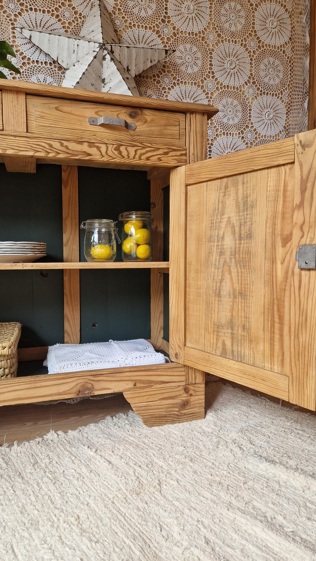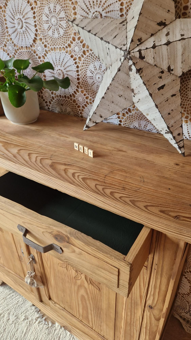 Entièrement aerogommée puis poncée en finition il est protégé à la cire antiquaire @liberon_officiel L'intérieur est travaillé dans des tons vert forêt allié au cuivré du pitchpin cela donne une jolie pièce automnale 🍂🍁.